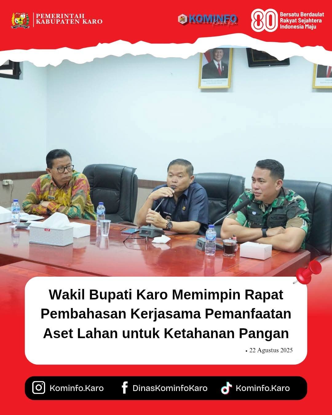 KARO (SUMUT) KOMPAS86.com__, Wakil Bupati Karo, Komando Tarigan, S.P., didampingi oleh Pj.Sekda Karo, Dr. Drs Eddi Surianta Surbakti, Mpd., Memimpin Rapat Pembahasan Kerjasama Pemanfaatan Aset Lahan untuk Ketahanan Pangan yang dilaksanakan pada tanggal 22 Agustus 2025 di Ruang Rapat Bupati Karo.