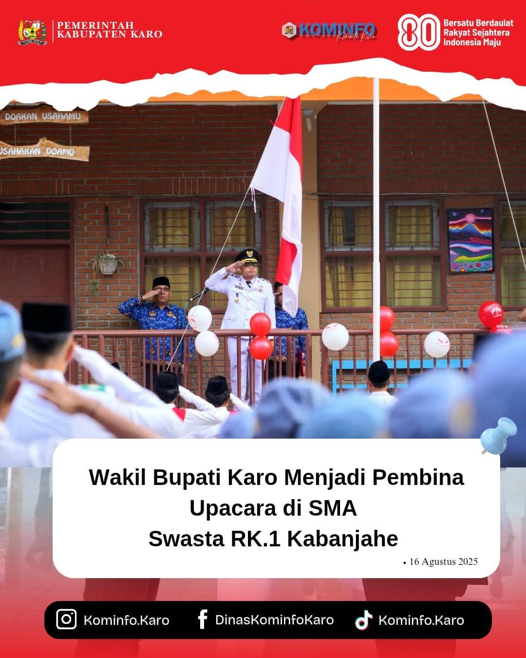 KARO (SUMUT) KOMPAS86.com__, Dalam rangka memperingati Hari Ulang Tahun ke-80 Kemerdekaan Republik Indonesia, Wakil Bupati Karo, KomandoTarigan, SP., bertindak sebagai Pembina Upacara di SMA Swasta RK.1 Kabanjahe.