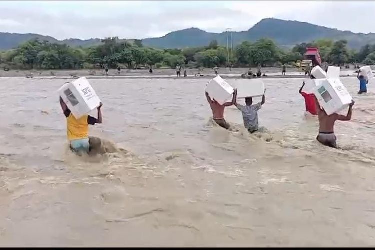Warga kupang, Provinsi NTT nekad melintasi banjir dengan memikul puluhan kotak suara,13/02/2024.