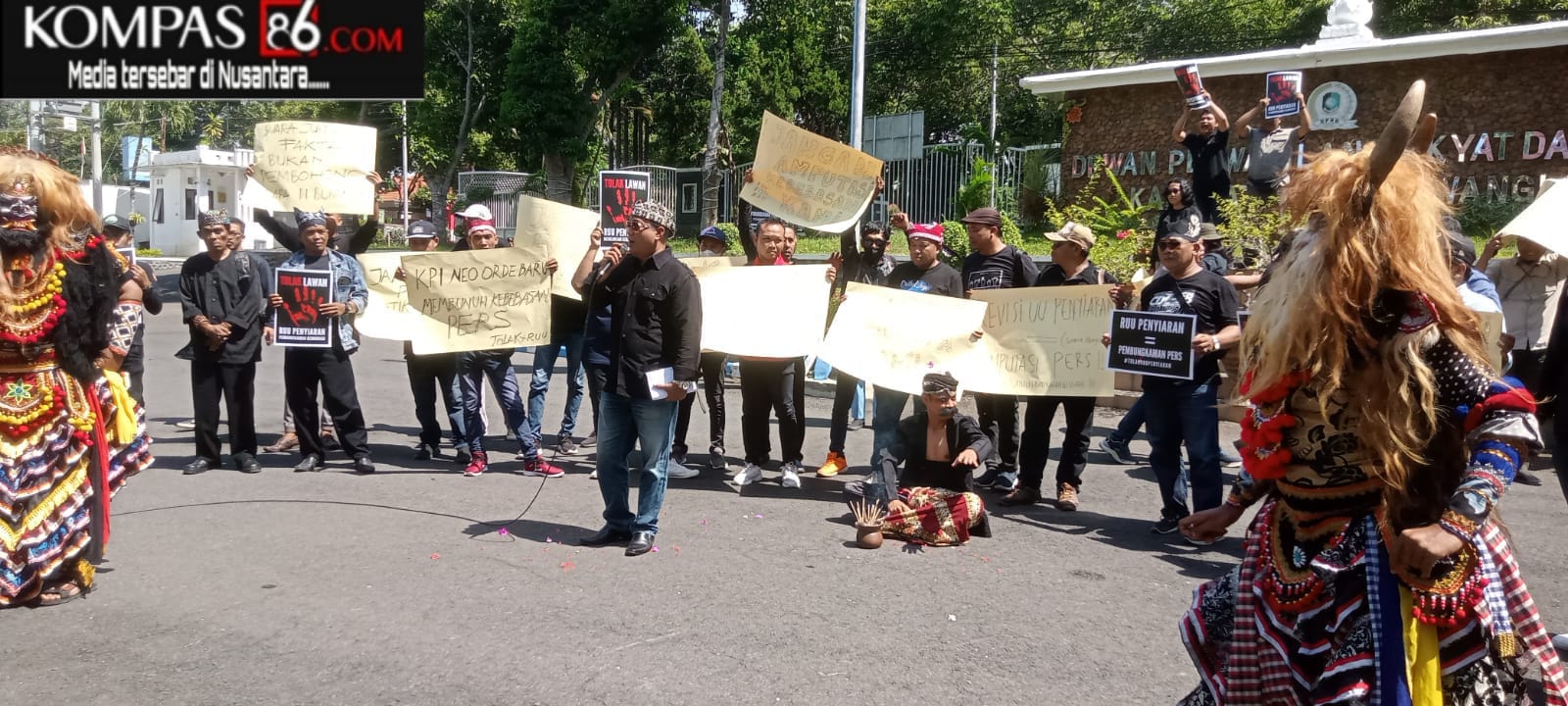 Dalam aksi tersebut juga diselingi teatrikal seniman jaranan yang menari di depan Gedung DPRD Banyuwangi. ( Dwi )