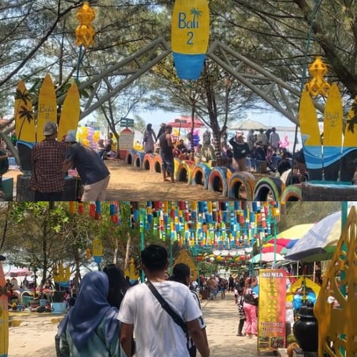 Selain panorama laut dan pasir yang landai, pengunjung bisa memanfaatkan gazebo untuk bersantai, mencicipi kuliner seafood segar, hingga berfoto di spot yang disediakan pengelola. Ramainya wisatawan di hari Minggu juga memberi dampak positif bagi pedagang lokal yang berjualan di sekitar lokasi.
